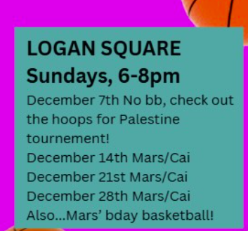WNBGay Basketball-Sunday December 14th, 21st, 28th 6-8pm, $7 or free if cost would prevent you from coming, in Grace’s gym.